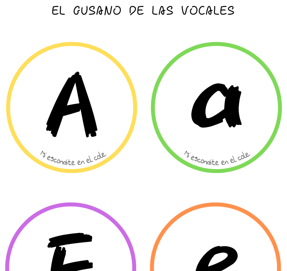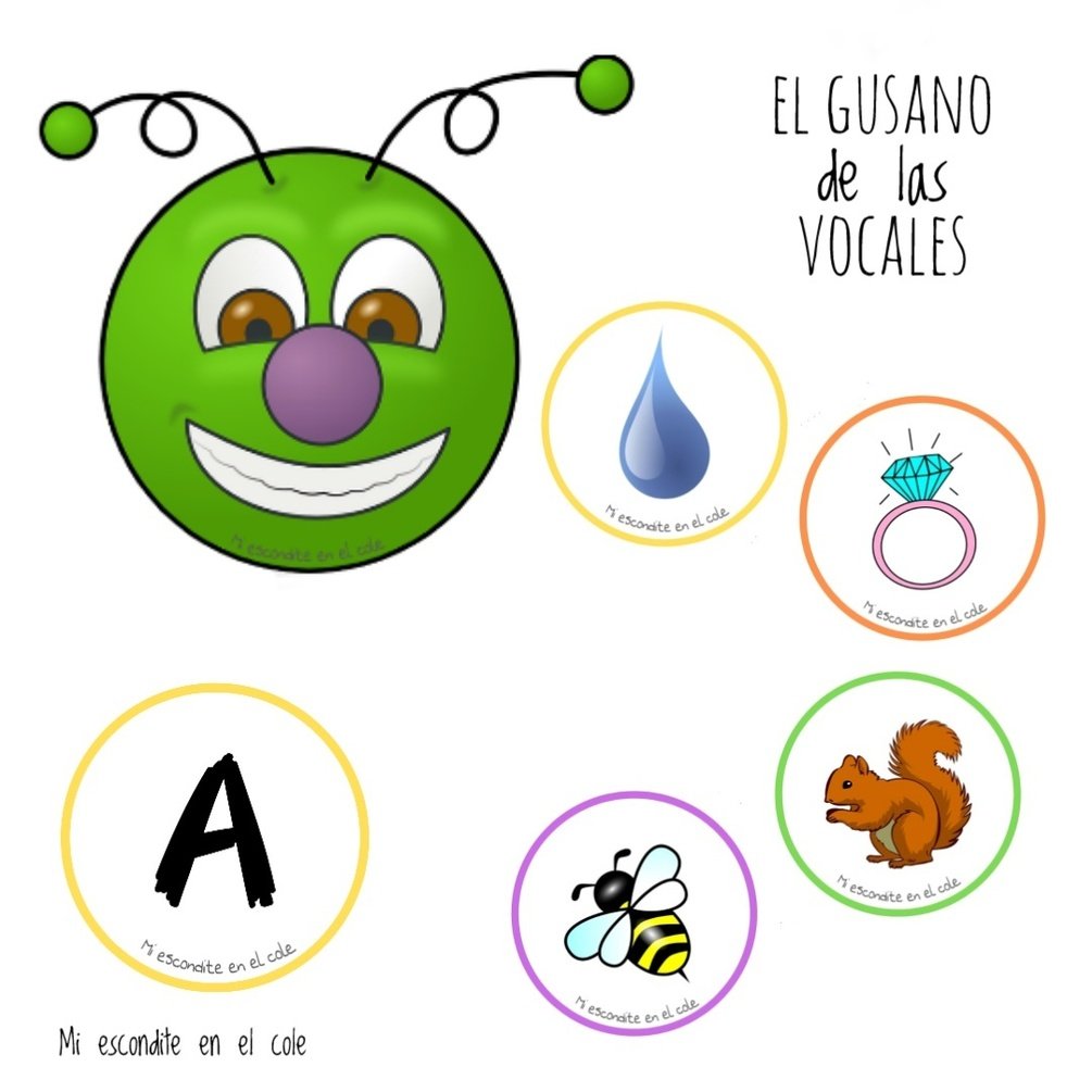 - Contenido: 14 páginas que contienen 2 cabezas del gusano (de distinto tamaño), 40 imágenes que comienzan por vocal (8 imágenes de cada vocal) y las vocales en mayúscula y minúscula.